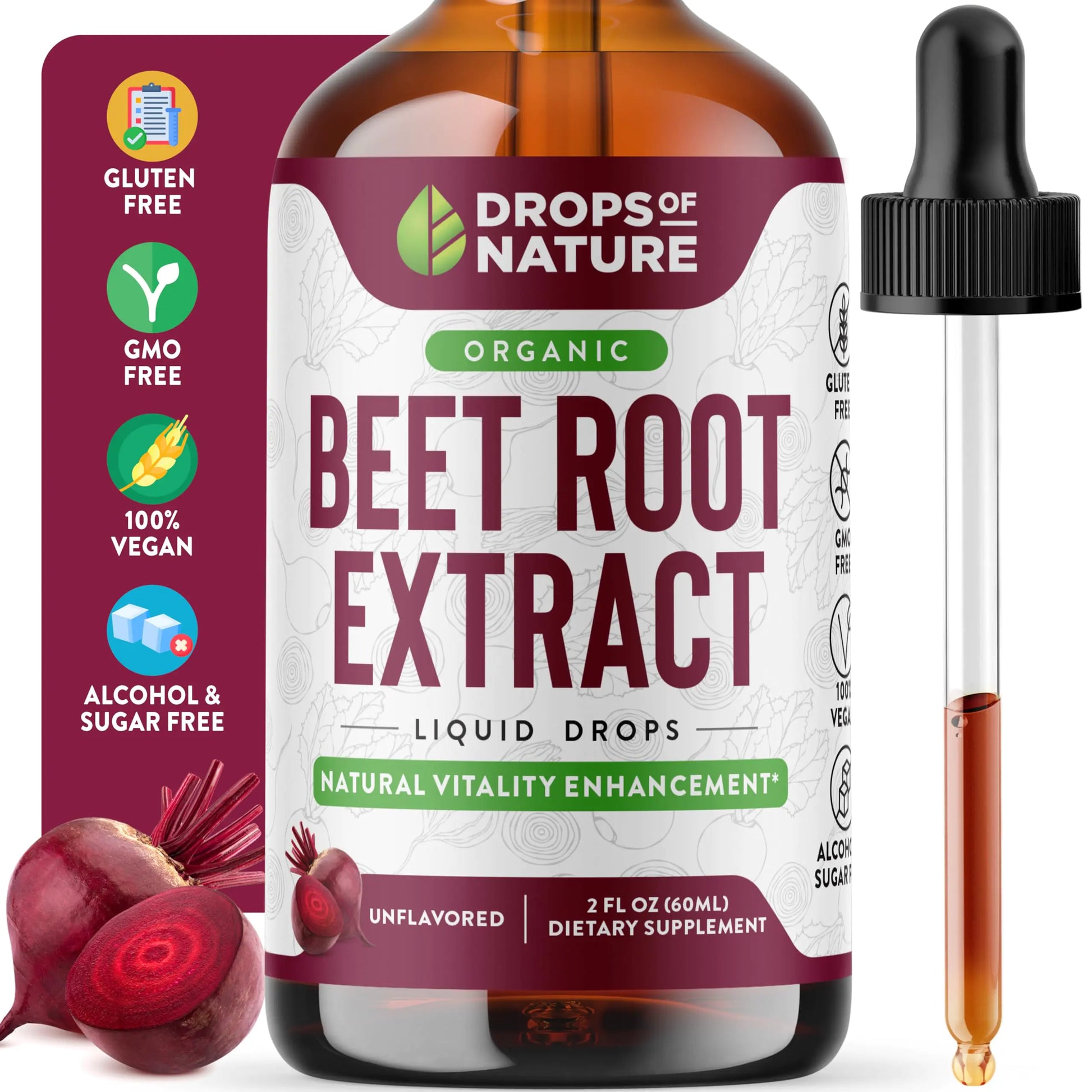 ["Supports Heart Wellness: Experience the benefits of our unflavored Organic Beet Root Extract drops; crafted for those prioritizing heart wellness; integrates beets nutritional profile to enrich your routine; offers a solution for cardiovascular health" Enhances Physical Stamina: Boost energy and endurance with our Beet Root Extract supplement; infused with the vitality of organic beets; designed for individuals aiming to amplify energy levels and stamina; ideal for sustaining energy throughout the day "Promotes Antioxidant Protection: Elevate your bodys defenses with our Beet Root drops; a rich source of antioxidants; harnesses the protective essence of beets; supports cellular defense mechanisms naturally; provides unparalleled antioxidant protection" Supports Circulatory Health: Unlock optimal circulatory health with our Organic Beet Root Extract drops; designed to support the circulatory system; draws on the power of beets for maintaining healthy blood flow; provides a solution for overall wellness Nutritional Support for Well-Being: Packed with the goodness of organic beets; delivers essential vitamins and minerals for daily well-being; offers a synergistic blend of nutrients; a cornerstone for those dedicated to a balanced and nourishing lifestyle "Rigorously Lab-Tested: Our supplement undergoes extensive laboratory testing to meet the highest standards; Its free from yeast milk gluten gelatin peanuts shellfish dairy and artificial colors and flavors ensuring unparalleled purity"]